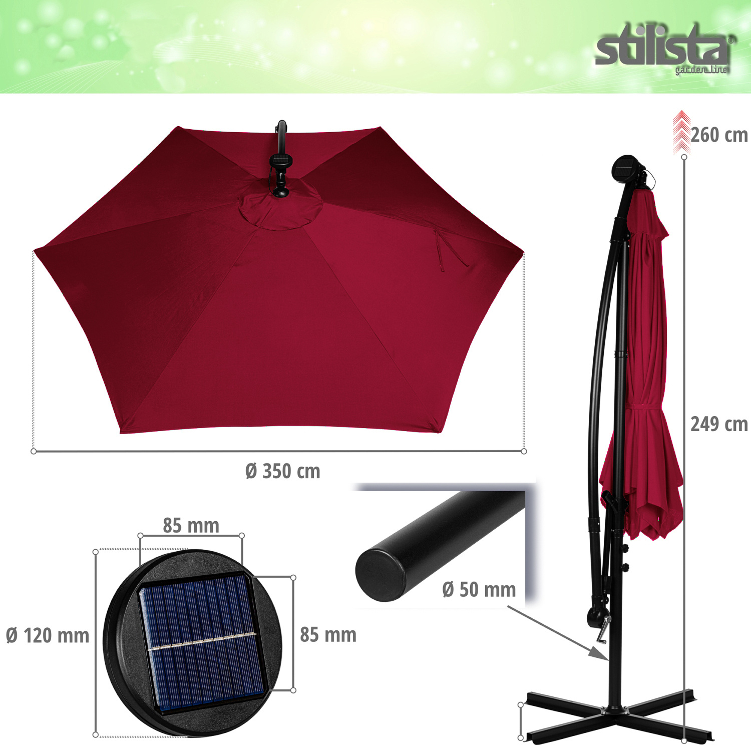 - Parasol o średnicy 3,5m na wysięgniku z oświetleniem LED jest doskonałym rozwiązaniem dla osób ceniących wypoczynek w ogrodzie, na balkonie czy tarasie.
