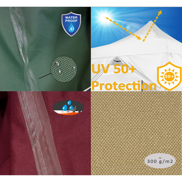 Pawilon wykonany z bardzo dobrego gatunkowo materiału poliestrowego 300D z dodatkową powłoką PVC i podklejanymi szwami. Posiada ekspresowy (nożycowy) system rozkładania co znacznie ułatwi rozkładanie oraz składanie. W przeciwieństwie do tańszych odpowiedników wykonany jest z anodowanego aluminium EV1 o zwiększonej grubości. Idealny na okazjonalne uroczystości takie jak: chrzciny, komunię, dzień mamy, taty lub na weekendowe grille.
