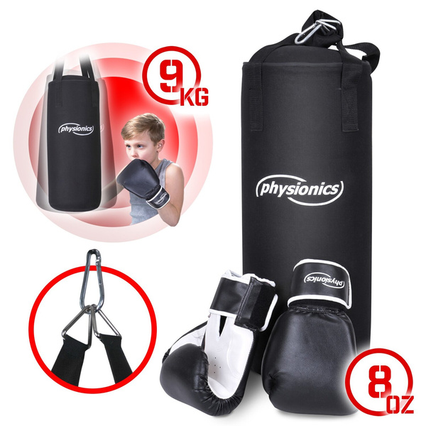 Zestaw bokserski zawiera worek treningowy i rękawice bokserskie. Worek treningowy o wysokości około 60 cm i wadze około 9 kg jest przeznaczony przede wszystkim dla dzieci i młodzieży. Jest odpowiedni zarówno dla początkujących, jak i zaawansowanych dzieci, które chcą trenować MMA, kickboxing lub inne sztuki walki ze stabilnym workiem. Rękawice (rozmiar 8 OZ) pomogą Twojemu dziecku ćwiczyć refleks, siłę i wytrzymałość.