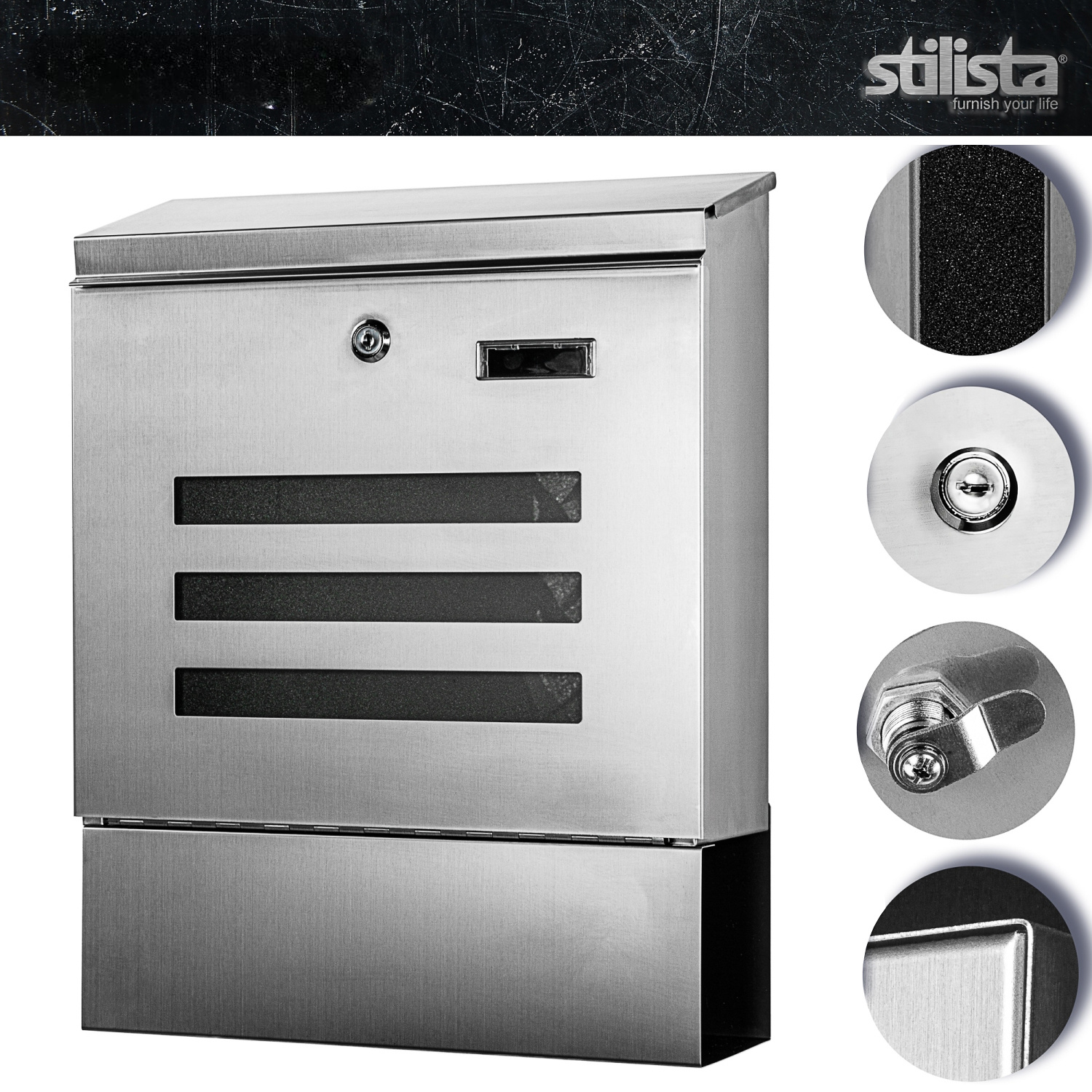 Skrzynka na listy w całości wykonana ze stali nierdzewnej szczotkowanej, dzięki czemu ma niepowtarzalny wygląd i jest odporna na warunki atmosferyczne. Zamykana na kluczyk. Wyposażona w miejsce na gazetki i ulotki reklamowe oraz posiada miejsce na zamieszczenie nazwiska lub numeru domu.