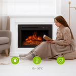 Pomimo że płomień jest wirtualny, kominek rzeczywiście ogrzewa. Dzięki dwóm poziomom mocy (1000 W / 2000 W) pozwala na regulację temperatury w zakresie 15–30°C, szybko zapewniając przyjemne ciepło.